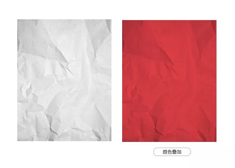 找到一个褶皱纸张的纹理素材,其目的主要是利用褶皱所呈现出来的层次感变化,然后对其执行图层样式-颜色叠加-正片叠底,选择一个亮红色得出右边的效果,在此基础之上可以利用曲线调整明暗关系;