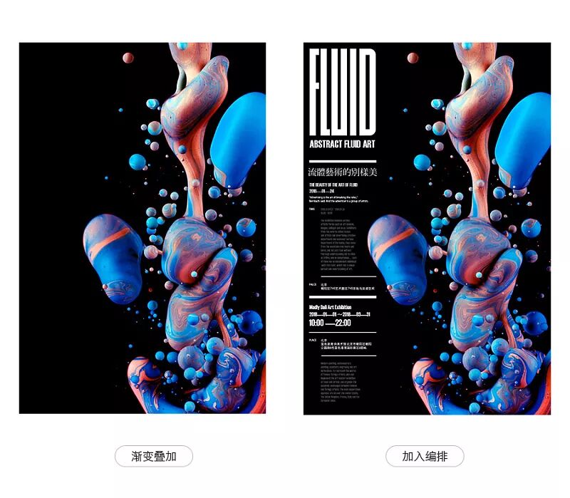 在之前的基础上对素材图层添加渐变叠加,模式选择为柔光,然后调整合适的颜色即可,如作图所示,整体看起来更加的具有视觉效果和表现力,最后把文字置入到版面当中,文字则是使用衬线体和无衬线体两种字体,再编排的过程文字之间形成一定的层次,同时通过文字的大小和颜色的明暗以及形式的编排上,让重要的信息突出,不重要的信息弱化,并与主体之间不规则的形成错落的层次和方形的引导,使版面更加和谐;