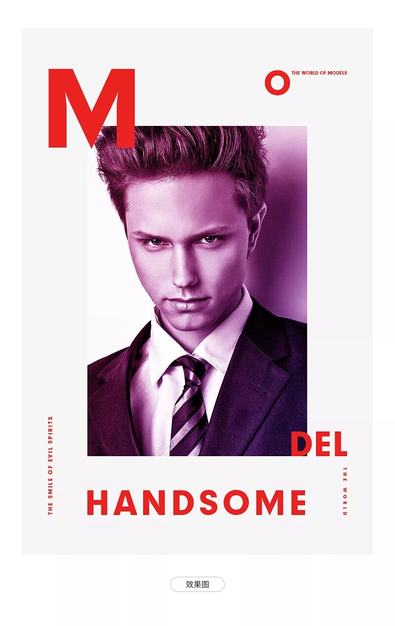 如左图所示;把文字编排好之后置入到画面当中,根据人物自身的颜色选择一个深灰偏蓝的颜色,(在设计中很多设计师都会这么用)又下角的文字会与人物重合,就选择一个红色作为区别,虽然模特有种邪魅的帅气,整体看起来过于深沉,然后把所有文字的颜色全部统一用红色,这个时候文字与主体之间则会有上下的层次,但却与人物形成极大的反差,既能凸出人物,又能凸出文字,可以说到这里基本上就可以了,然后利用多色的层次对人物主体执行渐变叠;