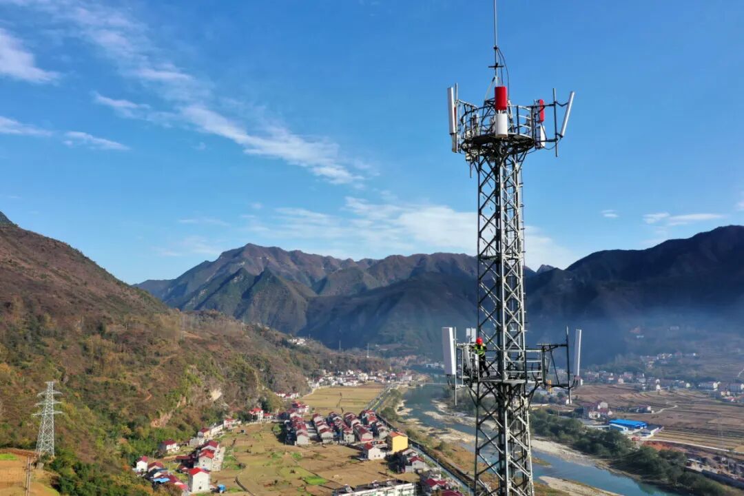 中国移动湖北保康分公司工作人员在湖北省襄阳市保康县马桥镇一处 5G 基站上进行设备调试。来源:中经视觉