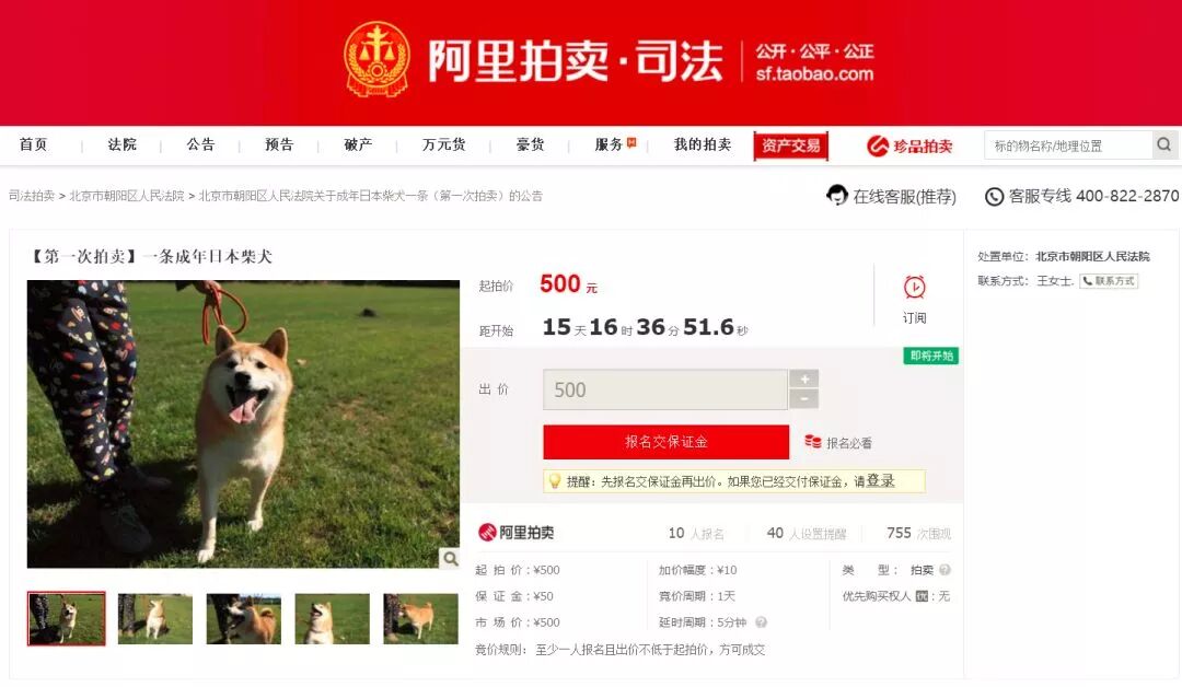 被拍卖的是一只4岁的柴犬,由北京朝阳法院发起拍卖,起拍价500元。
