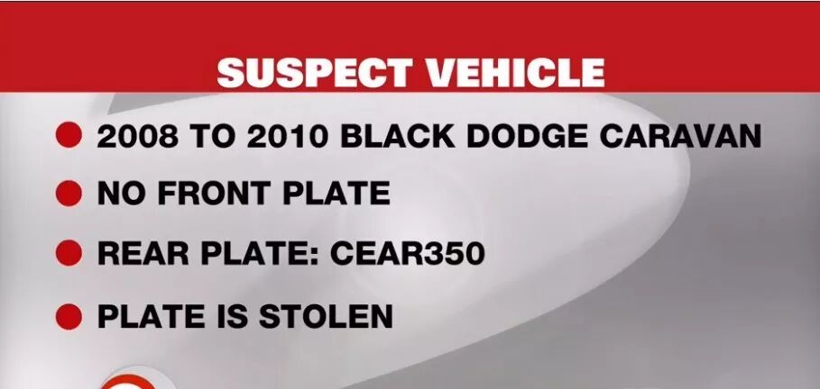 根据CP24报道,劫匪的作案工具是一辆黑色道奇 Carvan minivan, 2008 至 2010款。劫匪车牌号为:CEAR 350,后经警方确认改车牌是盗窃而来。