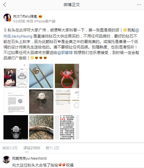 今天,向太这个cp粉头因为这两天儿砸求婚钻戒的事儿传得沸沸扬扬,亲自出来辟谣,上了热搜第一。