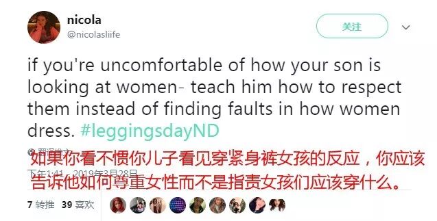 针对这位麻麻的行为,有网友一针见血地指出:如果你担心儿子看到穿紧身裤女孩的反应,你应该教会他学会尊重女性,而不是在这里来教育年轻女孩们该穿什么不该穿什么。