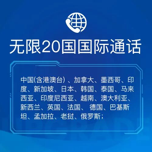 ● 中国电信CTExcel所有套餐均包含:无限20国国际通话、无限流量、无限美国通话、无限全球短信,以及7*24中英双语客服。