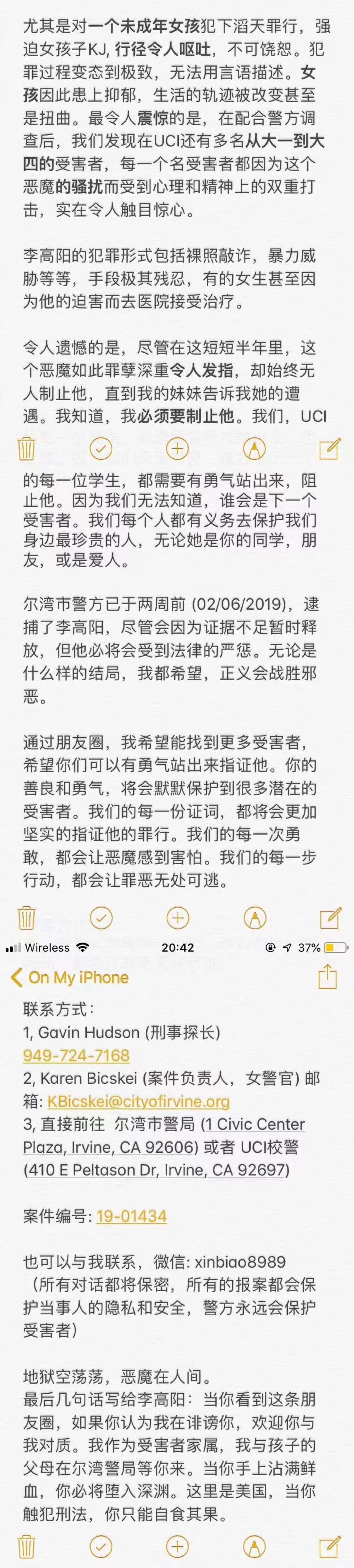 今年2月,有受害者爆料:加州大学尔湾分校学生李高阳,涉嫌性侵多名中国女留学生,事后还以要公布视频,来敲诈勒索对方钱财。