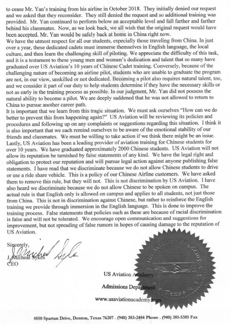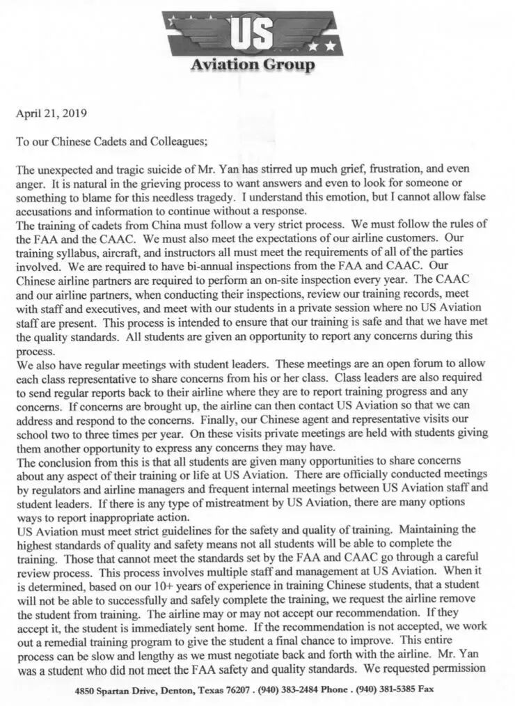 USAA航校总裁公开信,现已删除
