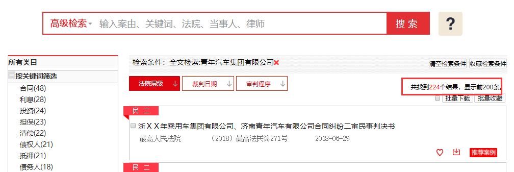 在法院公开的中国裁判文书网上,日,以“青年汽车汽车集团有限公司”为关键词搜索,涉及的案件多达224件。