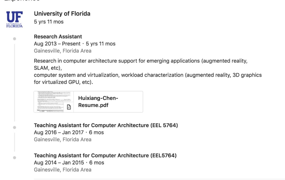 小陈今年30岁,在佛罗里达大学电子与计算机工程系攻读博士学位。从他的领英主页可以看到,他在佛罗里达大学学习和工作已经接近6年。