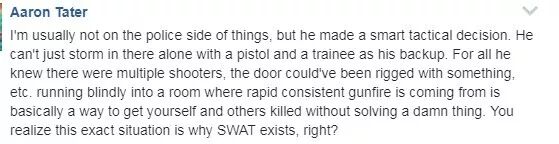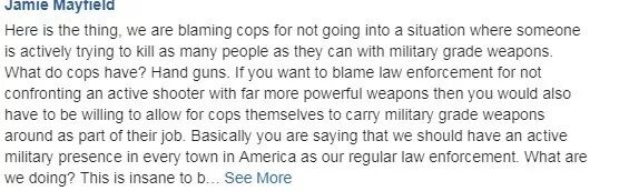 也有网友认为,我们不应该期望一名警官与拥有军用级武器的枪手进行对抗,这不能从根本上解决美国的枪支问题。