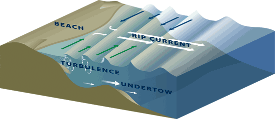 切勿惊慌,下层逆流仅会把人带到下一个破碎波,而不会强拉着人远离岸边到外海,因此不算太危险。