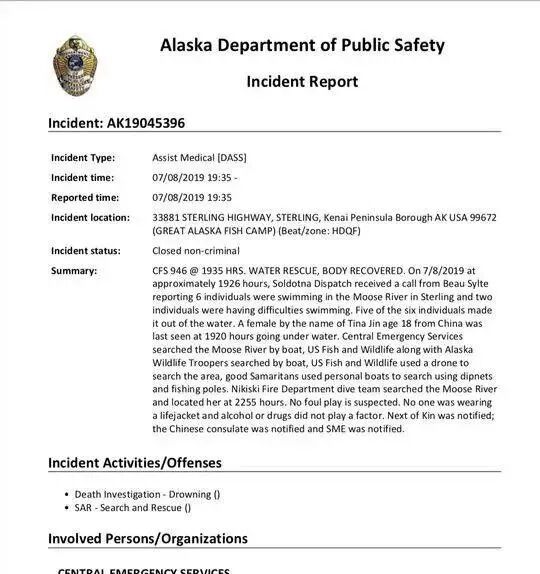 美国阿拉斯加警方出具的案件调查报告详细还原了小婷溺亡的详细经过。