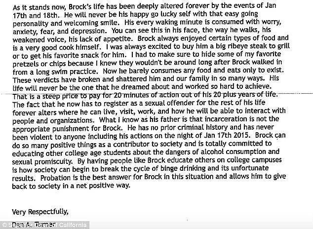 而令人震惊的是,这个6个月的判决不仅让受害人女生不满,让公众不满,Brock Turner的父亲还不高兴呢。他也写了一份声明要求法官给儿子减刑,并对儿子性侵的罪行轻描淡写,称判决让吃货儿子对平时最钟爱的牛排都没了胃口,仅仅20分钟的行为,却毁了儿子的一生,让他付出了过于惨重的代价。![]()