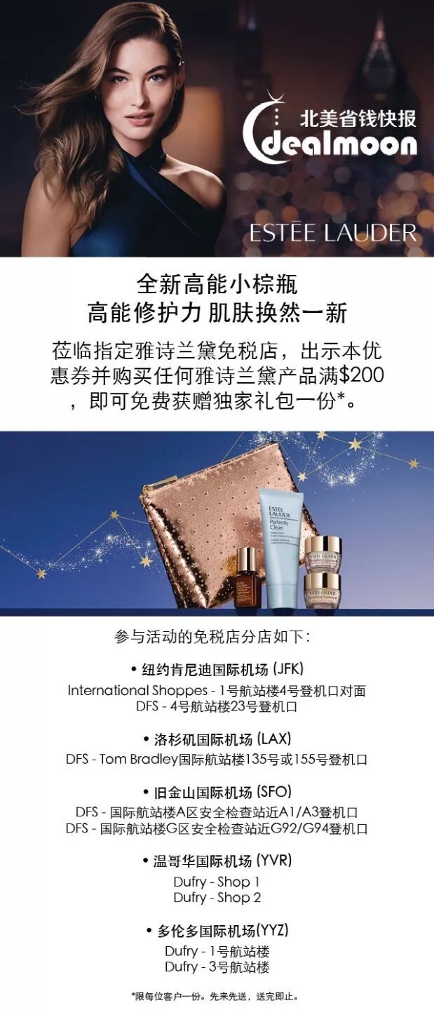 Dealmoon粉丝独家福利!出示下方优惠券并购买任何雅诗兰黛产品满$200,即可免费获赠独家礼包一份(限每位客户一份。先来先送,送完即止。)