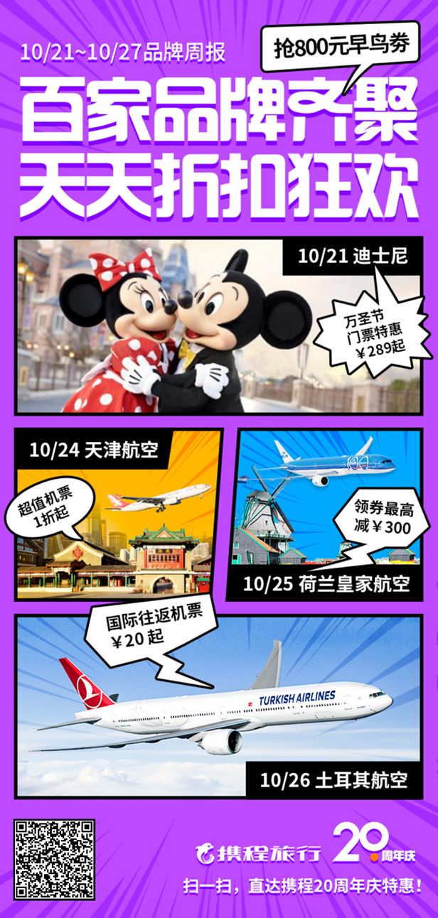 此次在20周年庆之际,携程联合了百家品牌,每天都有酒店、机票、门票及目的地等不同的品牌日,有秒杀/免房/免票/预售等不同的优惠形式,主打折扣低价;同时还能让用户在享受各项折扣低价的同时,再享受折上满减,可谓诚意满满。