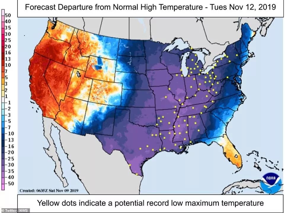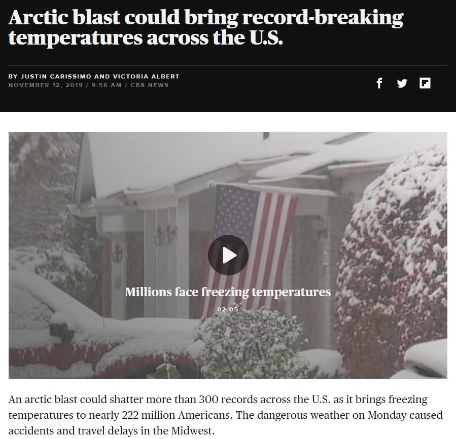 而到了本周三,预计将会有近100个监测站达到或者打破自己的最低温记录。