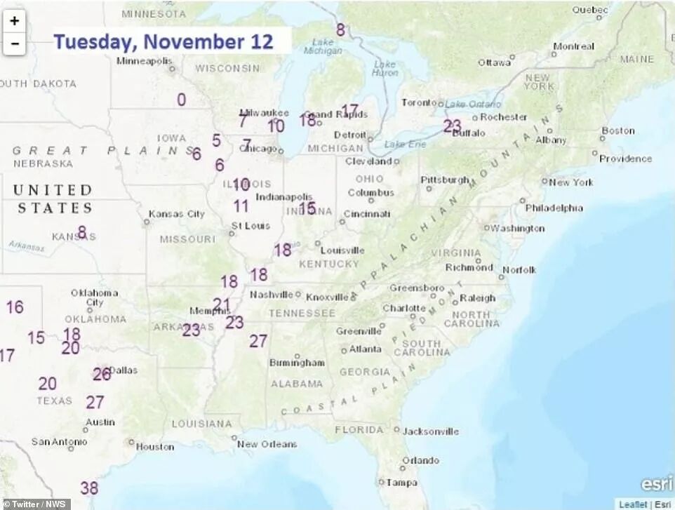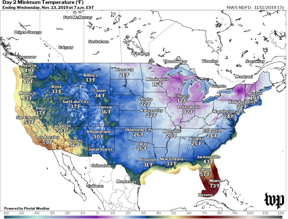 本周一早晨,底特律、堪萨斯城和密尔沃基早早下起了雪,其中堪萨斯城从周六到周一,温度暴跌了近50度。截止周一早晨7点,蒙大拿州的Malta“喜获”全美目前实时最低温度:-24F (相当于零下31摄氏度左右)