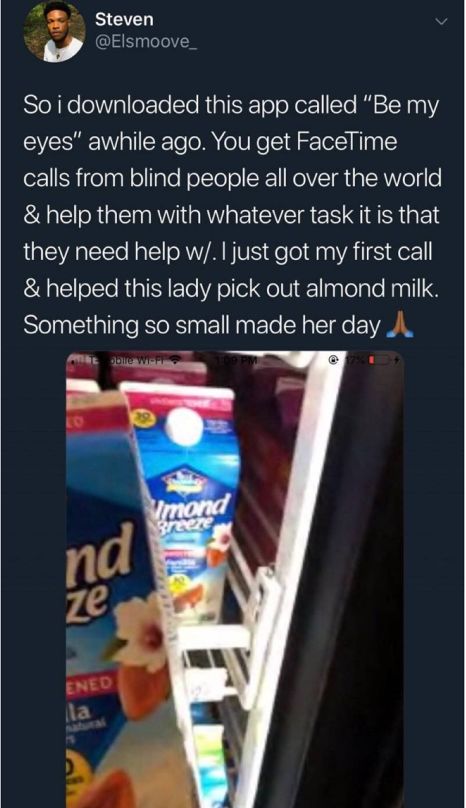 刚刚我接到了第一位盲人求助者的电话:通过视频,我协助他买到了杏仁牛奶!