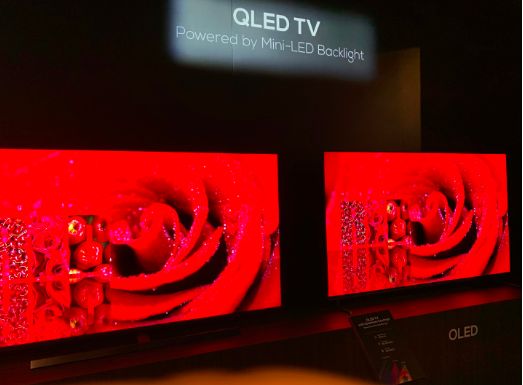 相比LG的OLED,三星的QLED今年的杀手锏是miniLED背光的应用。miniLED背光简单地说就是局域控光的极致,将原本数十区上百区的局域控光直接提升到数以千计的控光区域,更细致的局部背光照明也将对比度提高到100万:1以上级别,同时采用RGB LED背光模组让色域达到100% BT2020覆盖。解决了对比度和色域、色彩鲜艳度之后,miniLED无机材料还无需担心OLED的烧屏问题,而miniLED背光的厚度也比传统直下式局域控光模组要薄很多。