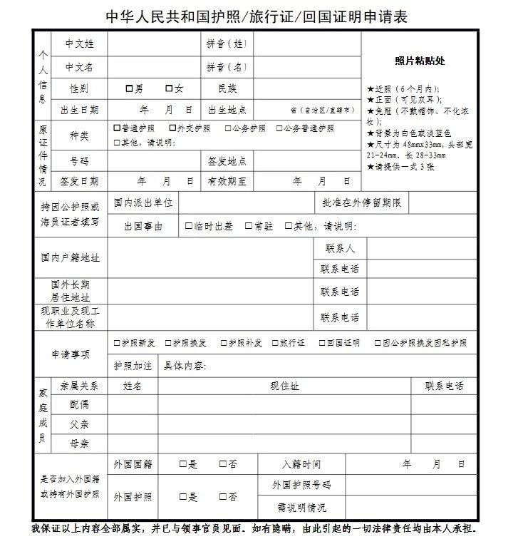 如实、完整填写《中华人民共和国护照/旅行证/回国证明申请表》1份;(大使馆不接受手工填写版本,请打印)
