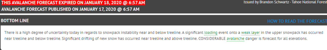 Sierra 雪崩研究中心曾提醒,树线附近和下方的积雪不稳定,无论在哪个位置,预计有极大的雪崩危险。