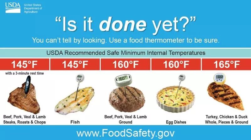 以下是USDA建议的各种肉类煮熟的安全最低内部温度(PS,新闻说新型冠状病毒在56C/133F以上的温度下能被杀死):