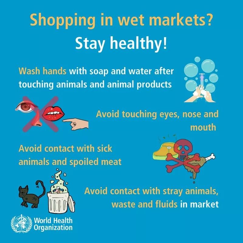在武汉新型冠状病毒的流行地区的活体农贸市场里走动时,应避免无保护地直接接触活体动物,也要避免直接接触与动物接触的物体表面;