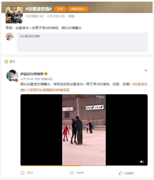 前几天,谷爱凌被拍到与一位高大帅哥在滑冰时接吻,样子非常的甜蜜。今天微博热搜瞬间冲到了5.3亿: