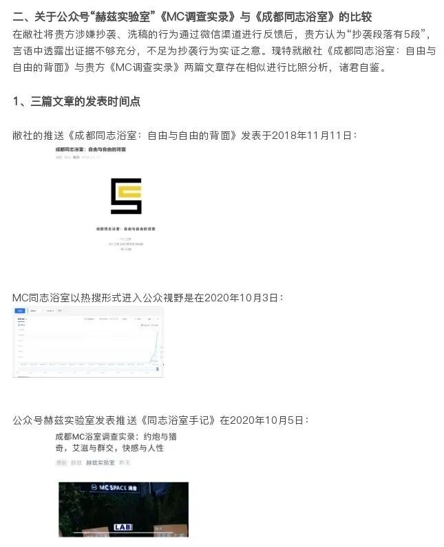 2020年10月4日,微信公众号“赫兹实验室”(以下简称“赫兹”)发表了文章《成都MC浴室调查实录:约炮与猎奇,艾滋与群交,快感与人性》,文章在一天内达到了10万+的阅读量。当晚,陆续有常识的读者向“常识”反映,“赫兹”的文章与“常识”于2018年11月11日发表的《成都同志浴室:自由与自由的背面》有大部分重合内容。