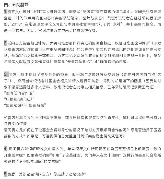 实际上,所谓的“小刘”是四川某都市报的记者,姓杨,就因为在《常识》原文的评论区留言,她“变性”成为了“小刘”,留言也一字不差的成为了“赫兹”文章里的采访内容,甚至连标点符号都一样。