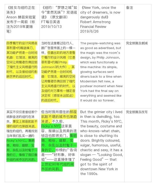此外,《常识》的工作人员还发现,“赫兹”此前也有文章涉嫌抄袭与洗稿。在“赫兹”2020年9月27日推送的随笔文章《妓女与纽约正在消失》中,作者回忆了自己曾经在纽约生活,并感叹纽约的离去。然而,这篇文章实际上是改写了“FT每日英语”《纽约:“梦想之城”如今“索然无味”?双语阅读》(原文翻译)一文。该文原为英国《金融时报》美国金融编辑罗伯特•阿姆斯特朗于2019年6月25日发表的《New York, once the city of dreamers, is now dangerously dull》。在“赫兹”这篇号称“生活随笔”的文中,作者对四季餐厅、廉价酒吧、华尔街Wasp等细节描写,均与“FT每日英语”的译文存在重合。详情可见以下调色盘。