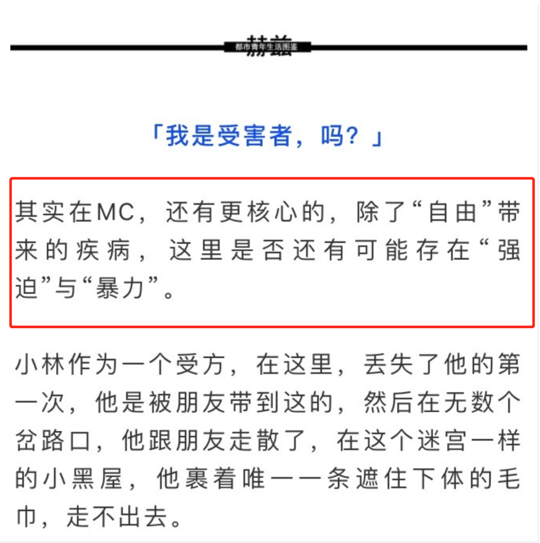 第一,赫兹以“调查手记”为名,在描述事实之外混杂了大量自身的观点和意见。赫兹在文中称“赫兹本人作为一个同志,MC浴室上热搜,甚至被取缔,我都双手赞成。”;“我觉得那是一种自我放弃的情景下的,宿命式的,报复式的欢愉。”......