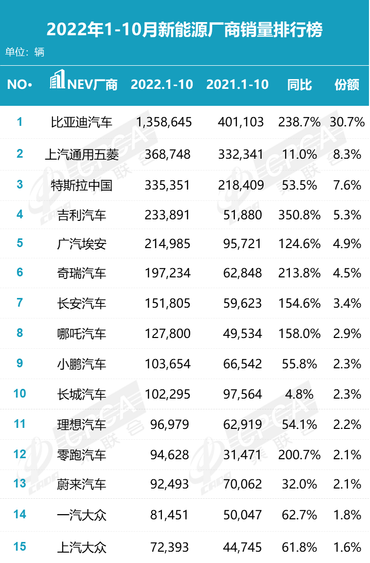 在乘联会发布的2022年1-10月新能源厂商销量排行榜中,南北大众加起来,也只能排到第七的位置,连比亚迪的零头都没有。
