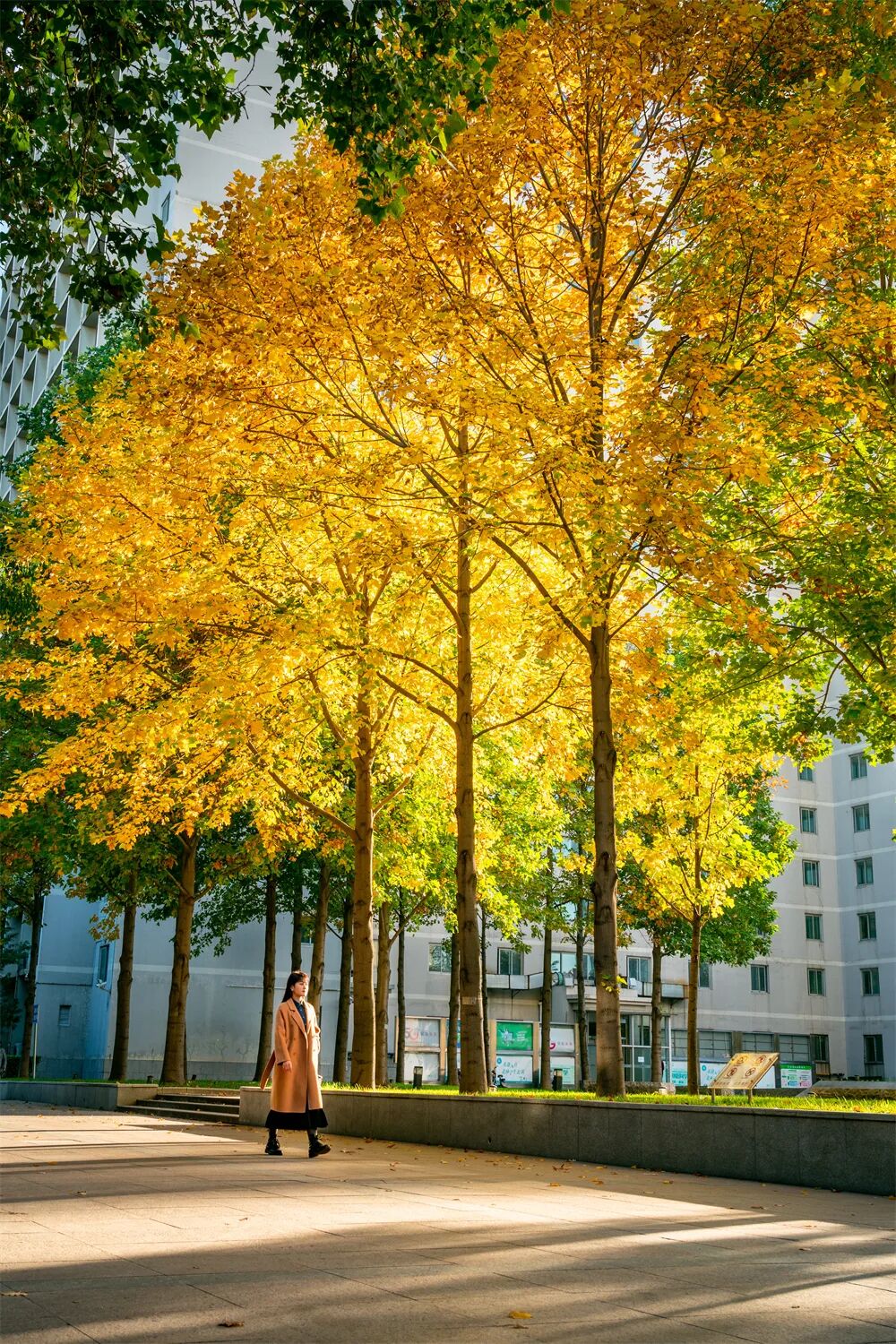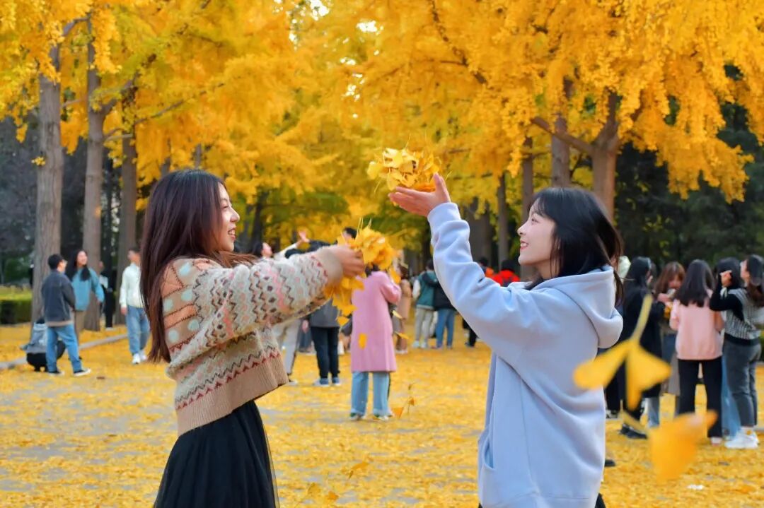 人们穿梭在银杏树下