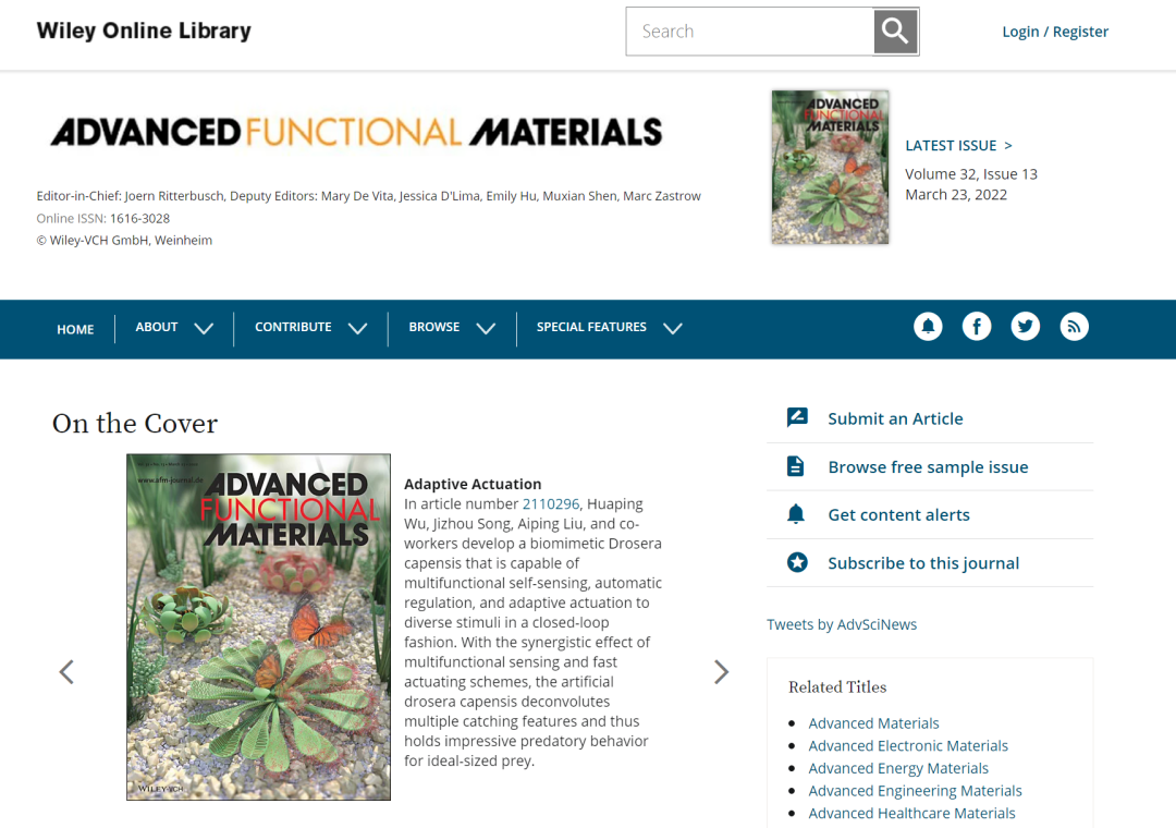 相关工作以“A Biomimetic Drosera Capensis with Adaptive Decision-Predation Behavior Based on Multifunctional Sensing and Fast Actuating Capability”为题作为封面文章(Cover Picture)发表在最新一期《Advanced Functional Materials》上。