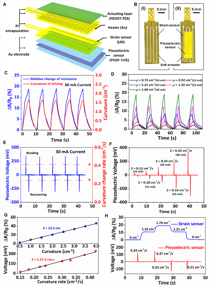 其中,压电模式检测应变速率的能力依赖于其频率响应,不同加载速率的刺激可以导致压电电压的差异。通过压电电压的峰值可精确检测出变形速率,同时从压阻模式的相对电阻变化可反馈出器件的弯曲应变。此外,通过压阻传感器和压电传感器的协同作用,可以同步感知柔性驱动器在弯曲变形过程中的弯曲应变、应变速率和方向。