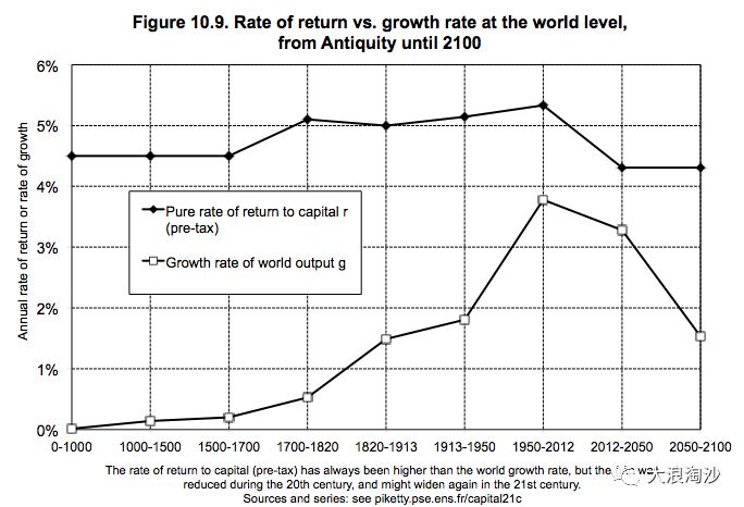 另一方面,资本的增殖速度是远超于劳动的收益率的,这一点同样在《疯狂的资本》这一章讲解过,通俗点解释就是你打工一辈子也赶不上人吃利息的钱。关于资本收益与劳动收益的差距,可以用卢梭形容贫富差距加剧的名言来完美诠释:“一个巨人与一个矮子在同一条道路上行走,他们每走一步都会使巨人拉大他与矮子之间的距离”。或者你是精英中的精英,被食利阶层选中做自己的代理人,自己辛苦奋斗一辈子,差不多可以让你的后代有机会成为“天生的资本家”。