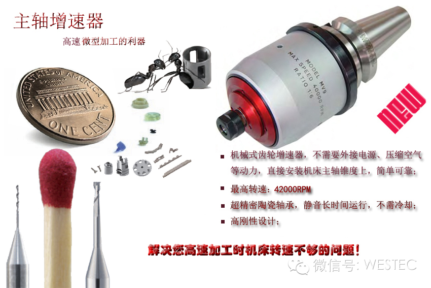 2、为什么需要使用增速器: 在使用微型铣刀和钻头加工时, 必须要使用很高的转速以提高表面加工质量,同时大大提高加工效率,如果机床本身的转速达不到要求时就要使用主轴增速器;