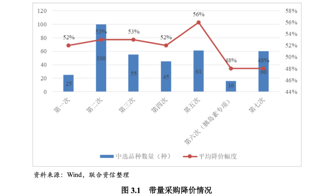 2018年12月,第一次带量采购竞标结果公示,共25个品种中选,涉及15家药企,平均降价幅度52%,部分产品降价幅度在90%以上。2019年9月,带量采购扩围竞标结果公示,在第一次带量采购品种的基础上进行了全国的拓面,范围更大,采购量也更大,采购价格在上一轮中选价上平均降价25%,进一步降低了药品的价格。2020年1月,第二次带量采购竞标结果公示,共涉及32个通用名、77家药厂的100个品种中选,另外非医保品种(安立生坦、他达拉非、注射用紫杉醇(白蛋白结合型))为首次纳入,平均降价幅度53%,最高降幅为93%。2020年8月,第三次带量采购竞标结果公示,中标55个产品,产生中选企业125家,中选药品品规191个,平均降价幅度53%,最高降幅95%,仿制药利润进一步被压缩。2021年2月,第四次带量采购竞标结果公示,中标45个产品,产生中选企业118家,平均降价幅度52%,最高降幅96%。2021年6月,第五次带量采购竞标结果公示,中标61个产品,产生中选企业148家,中选药品品规251个,平均降价幅度56%,最高降幅高达99%,注射剂成为集采主力剂型。2021年11月,第六次带量采购竞标结果公示,二代和三代胰岛素共16个品种、42个品规中选,产生中选企业11家,平均降价幅度48%,最高降幅高达74%,降价趋于理性化。这批带量采购充分考虑了企业实际产能,确保了用药稳定性,引导临床使用产品升级、行业发展创新升级,标志着带量采购从化学药拓展到了生物药领域。2021年12月,国家医保药品目录调整结果正式公布,本次共对117个药品进行了谈判,谈判成功94个(目录外67种,目录内27种),总体成功率80.34%;本次谈判成功的目录外67个独家品种的平均降价幅度62%,为历次谈判以来最大的降价幅度;2019年和2020年的降幅分别为61%和54%;本次谈判单一品种最大降幅为94%,2019年和2020年的最高降幅分别为85%和90%。