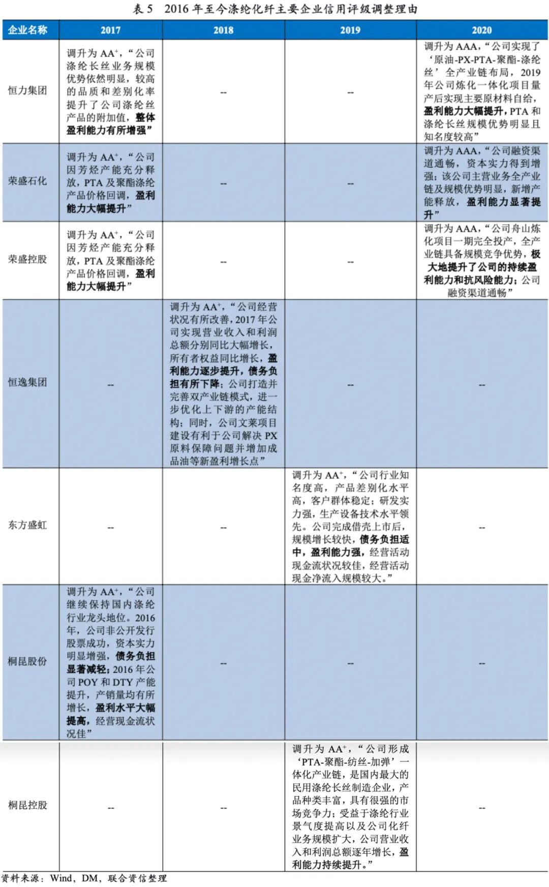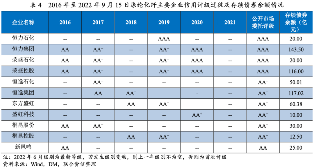 在近年来涤纶化纤行业产能集中度不断提升,行业龙头话语权很强的背景下,涤纶化纤龙头企业信用等级2016年以来普遍快速提升,普遍很高。产能规模扩大和产业链延伸使得企业盈利能力提升为最普遍的级别调升理由。