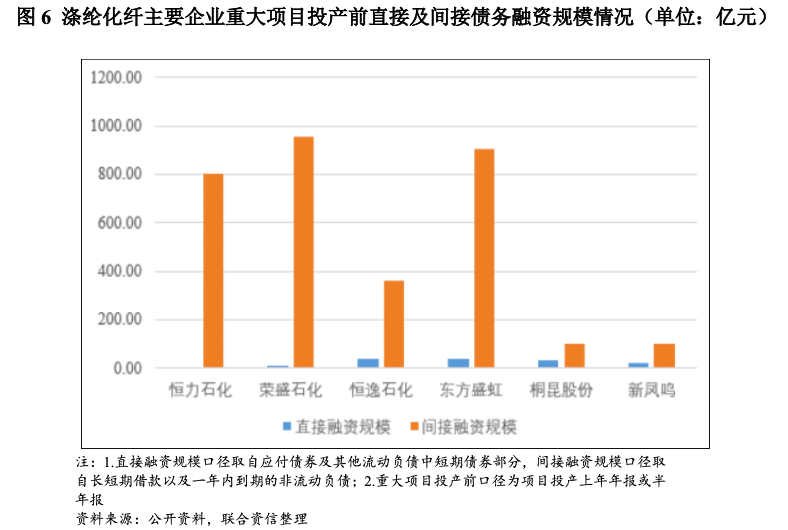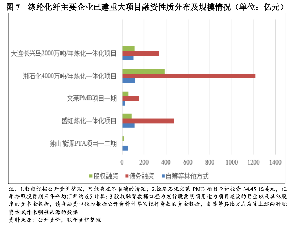 尽管理论上涤纶化纤企业应更多采用股权融资来支持项目建设,但以银行贷款为代表的债务融资成为已建成的重大项目融资的主要方式。