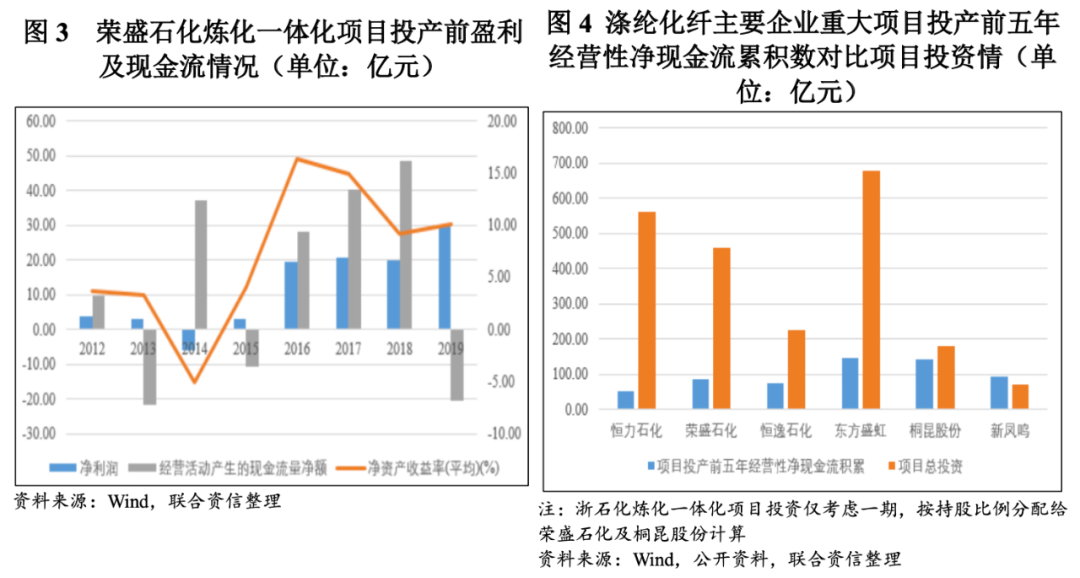 以荣盛石化为例,在2019年12月浙石化炼化一体化项目一期投产前,从图3可以看出,荣盛石化历年经营活动产生的现金流量净额和净利润、净资产收益率等盈利指标具有很大的波动性,这种波动性符合涤纶化纤行业周期性发展的特征,但无法满足重大项目持续稳定的资本支出需求。此外,由于化纤行业的周期性波动无法准确预测,重大项目做规划时企业自身内源融资一般无法满足项目建设资金需要。