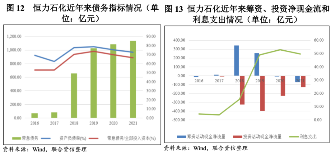 从图12可以看出,2018年炼化一体化项目进入建设期后,恒力石化带息债务规模短期内快速扩大,2018年底为656.29亿元,为2017年底的7.91倍;2018年底资产负债率亦较2017年底大幅上升15.09个百分点至77.72%。恒力石化在项目建设期内债务负担明显加重。