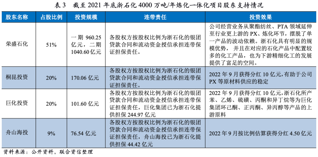 以荣盛石化浙石化4000万吨/年炼化一体化项目为例,该项目实施主体为浙江石油化工有限公司,荣盛石化和桐昆股份下属子公司浙江桐昆投资有限责任公司(以下简称 “桐昆投资”)分别持有浙石化51%和20%。此外,浙江省属国有企业巨化集团有限公司(以下简称“巨化集团”)通过子公司浙江巨化投资有限公司(以下简称 “巨化投资”)和舟山市属国有企业舟山海洋综合开发投资有限公司(以下简称“舟山海投”)分别持有浙石化20%和9%股权,截至2021年底累计向浙石化分别注资101.60亿元76.54亿元。其中,巨化集团为浙江省唯一的省属化工业务平台,舟山海投为项目所在地舟山市重要的海洋产业运营及基础设施建设开发主体。考虑到浙石化4000万吨/年炼化一体化项目实际总投资超过2000亿元,投资周期超过5年,化工行业波动性大,在股权设置上引入多家具备民营、国资等不同背景的投资者,有助于分散投资风险和降低融资成本。