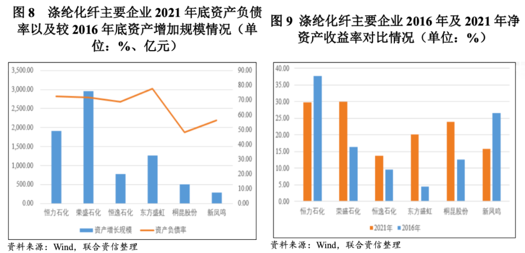 以新凤鸣为例,对比其他涤纶化纤龙头企业,新凤鸣自2016年以来经营较为稳健,未建设或参与投资资本支出巨大的炼化一体化项目,已建成的独山能源PTA项目更多依赖内源融资以及股权融资。2021年底新凤鸣资产负债率仅高于桐昆股份(参股的浙石化不在表内)(如图8),同时2016-2021年间新凤鸣的总资产增加规模最低。从图9可以看出,2016年新凤鸣净资产收益率仅次于恒力石化位居第二位,较其他多家龙头企业领先优势较为明显,但在这一轮行业龙头企业大扩张后,2021年新凤鸣的净资产收益率已处于较低水平,仅高于恒逸石化。综合图8以及图9分析,新凤鸣的案例说明低融资、低杠杆的扩张模式对于自有资本使用效率提升较慢,一定程度限制了企业的发展速度。