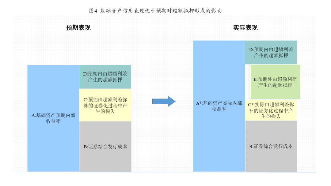 一般ABS产品在设计时,底层资产正常的违约成本是证券端综合发行成本之一,如果基础资产实际信用表现优于预期,令基础资产的实际现金流入高于预期,则实际上是提升了资产端的收益率,超额抵押的金额将会随之相应增加。具体如图4所示。