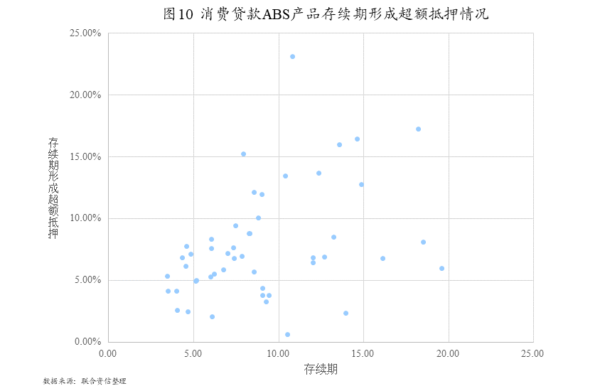 因消费贷款利率相对较高,消费贷款ABS产品通常存在可观的超额利差,是存续期形成超额抵押的主要推动力。同时,数据显示,存续期形成超额抵押的大小与证券存续期限以及循环购买的次数有关。超额利差越大、存续期越长(通常意味着更多的循环购买次数),存续期将形成更多的超额抵押。本次纳入统计的49单消费贷款产品存续期内均产生了正超额抵押(如图10),超额抵押的形成是很多消费贷款ABS夹层档证券信用等级得以提升的重要因素。