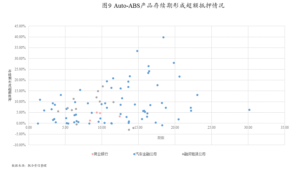 由于Auto-ABS产品底层贷款通常含押品,且车辆销售方可能会进行贴息销售,个人汽车贷款利率相对较低。如果贷款利率低于证券端综合发行成本,将会形成负利差,进而在存续期形成负超额抵押,增加券端的兑付压力。从本次统计的存续期项目来看,为缓释该风险,过半此类项目在发行时设置了一定的初始超额抵押(见图8)。