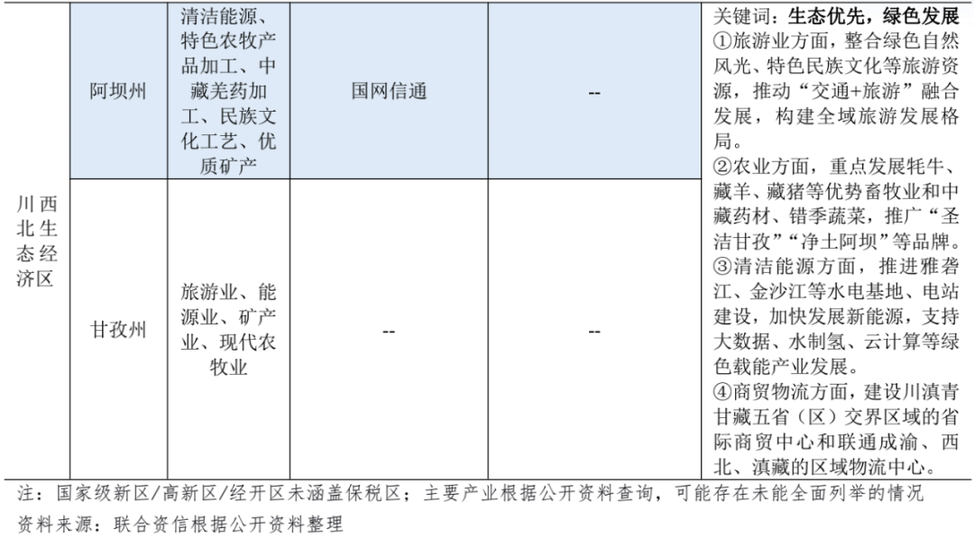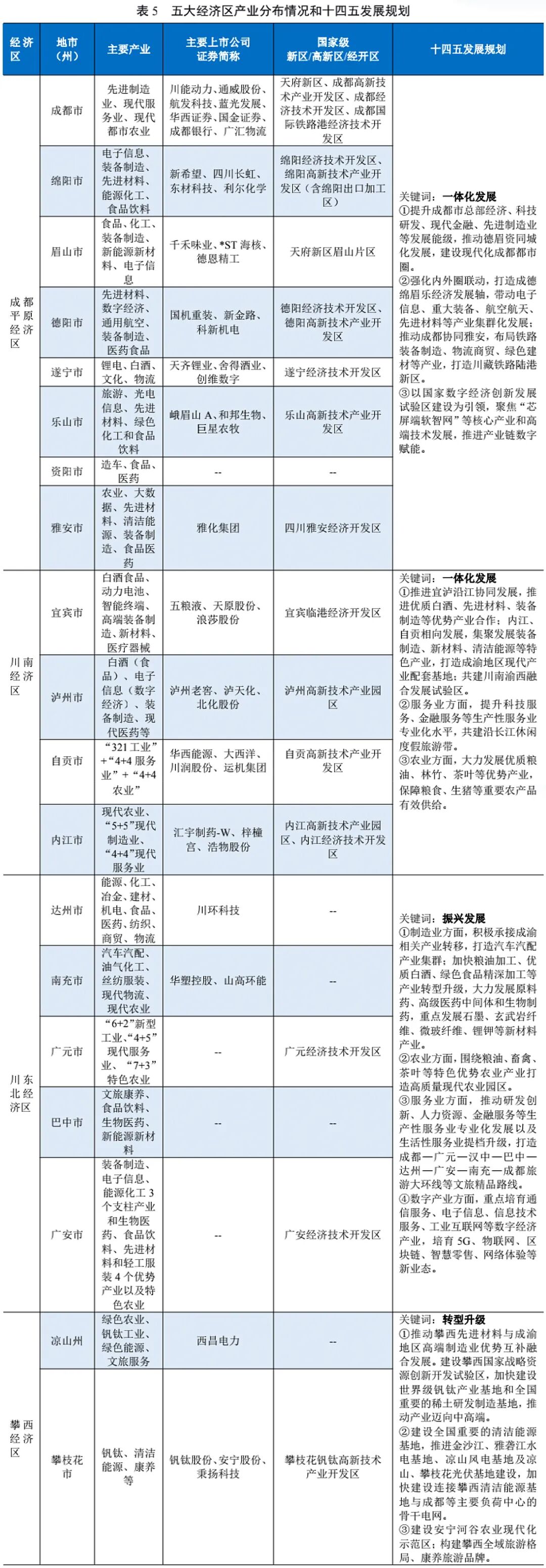 从产业分布来看,各地市(州)依托自身资源优势等发展相关产业,拥有1个国家级新区、18个国家级高新区/经开区和120个省级开发区,以及A股上市公司167家。其中,成都平原经济区和川南经济区产业基础相对较好。根据《成渝地区双城经济圈建设规划纲要》《四川省国民经济和社会发展第十四个五年规划和二〇三五年远景目标纲要》,成都平原经济区和川南经济区制定了“十四五”一体化发展规划。川东北经济区、川西北经济区和攀西经济区分别围绕“振兴发展、转型升级、生态优先”制定了“十四五”发展规划,未来发展路径明确。