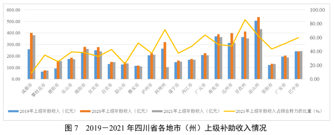 从上级补助收入规模来看,凉山州、成都市、南充市、甘孜州和达州市获得上级补助收入规模较大,2021年均超300亿元,其中凉山州最大,达432.16亿元。从上级补助收入在综合财力中占比来看,甘孜州上级补助收入占综合财力的比重高,为85.87%。
